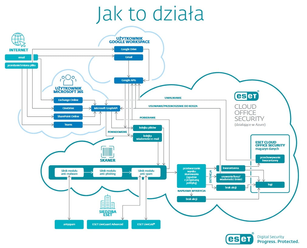 Rozwiązanie ESET Cloud Office Security zapewnia zaawansowaną ochronę aplikacji Microsoft 365 i Google Workspace. Połączenie filtrów antyspamowych, skanowania antywirusowego i rozwiązań do ochrony przed atakami typu phishing pozwala na ochronę Twojej firmowej komunikacji mailowej oraz zabezpiecza pliki przechowywane w chmurze. Przyjazna i przystępna chmurowa konsola zarządzająca zapewnia łatwy dostęp do informacji o plikach i próbkach skierowanych do kwarantanny. W razie potrzeby rozwiązanie natychmiast poinformuje Cię o wykrytych zagrożeniach.