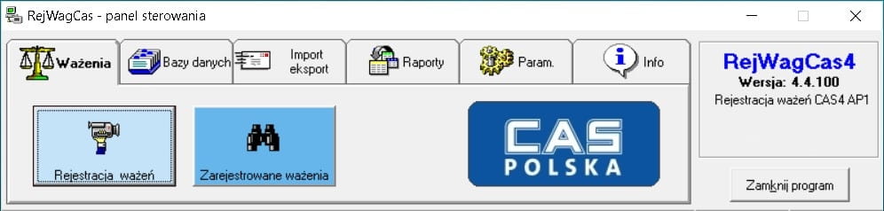 Program CAS RejWag umożliwia rejestrację ważeń oraz ich zapisywanie. Na podstawie odczytanych pomiarów możliwe jest rejestrowanie następujących parametrów: numer ważenia, numer wagi, data, godzina, masa netto, jednostka pomiarowa, kod produktu / operator, nazwa produktu, zakres ważenia.