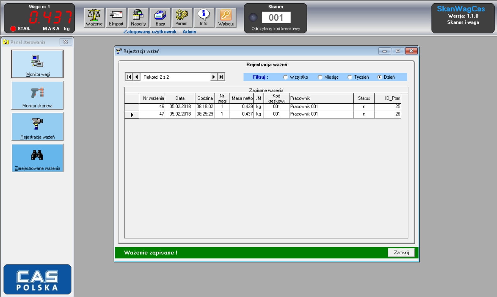 Program CAS SkanWag umożliwia rejestrację ważeń, korzystając ze skanera kodów kreskowych. Skaner pozwala na odczytanie towaru lub pracownika w momencie ważenia. Na podstawie odczytanych danych oraz wartości masy możliwe jest rejestrowanie następujących parametrów: numer ważenia, numer wagi, data, godzina, masa netto, jednostka pomiarowa, kod produktu / operator, nazwa produktu, zakres ważenia.