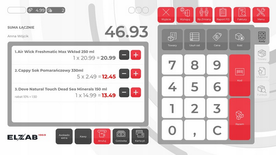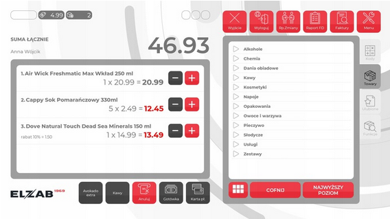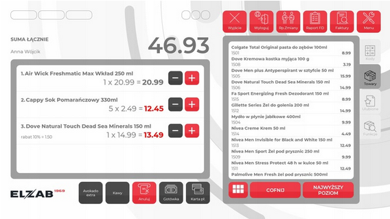 sprzedaż towarów po kodzie, przez wyszukanie na liście, za pomocą graficznych klawiszy bądź poprzez zeskanowanie czytnikiem kodów kreskowych,